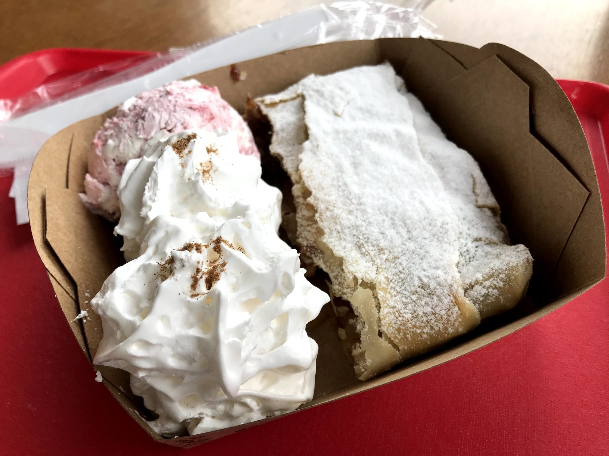 Apfelstrudel, tradicional da culinária europeia esse doce é feito com massa fininha e crocante (Filo) e leva tradicionalmente o recheio de maçã com canela. Existem muitas adaptações culinárias para essa maravilha, mas escolhemos a versão original para provar. Pedimos o chantilly fresco e sorvete caseiro de iogurte com framboesa para acompanhar. Preço? R$ 32 e serviu bem 2 pessoas.